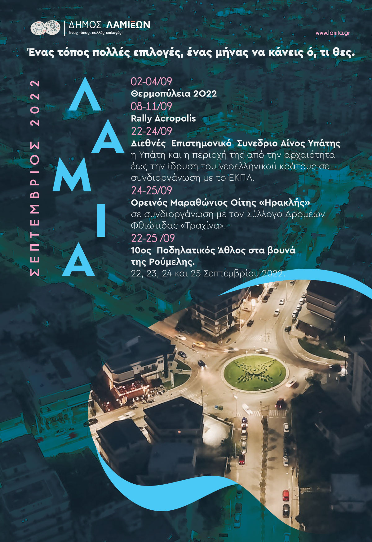 Στο κέντρο της Ελλάδας, στο κέντρο των εκδηλώσεων, η Λαμία για ένα ακόμη Σεπτέμβρη αποτελεί τόπο επιλογής, τόπο προορισμού, τόπο αναζωογόνησης. Ένας ιστορικός και συνάμα σύγχρονος «φάρος» υψηλής πολιτισμικής αξίας και ιδανικών, με εκδηλώσεις μεγάλου βεληνεκούς και ενδιαφέροντος, μεταφέροντας το όραμα, τον ενθουσιασμό και την δέσμευση της Δημοτικής Αρχής για ένα μοναδικό και ελκυστικό προορισμό.