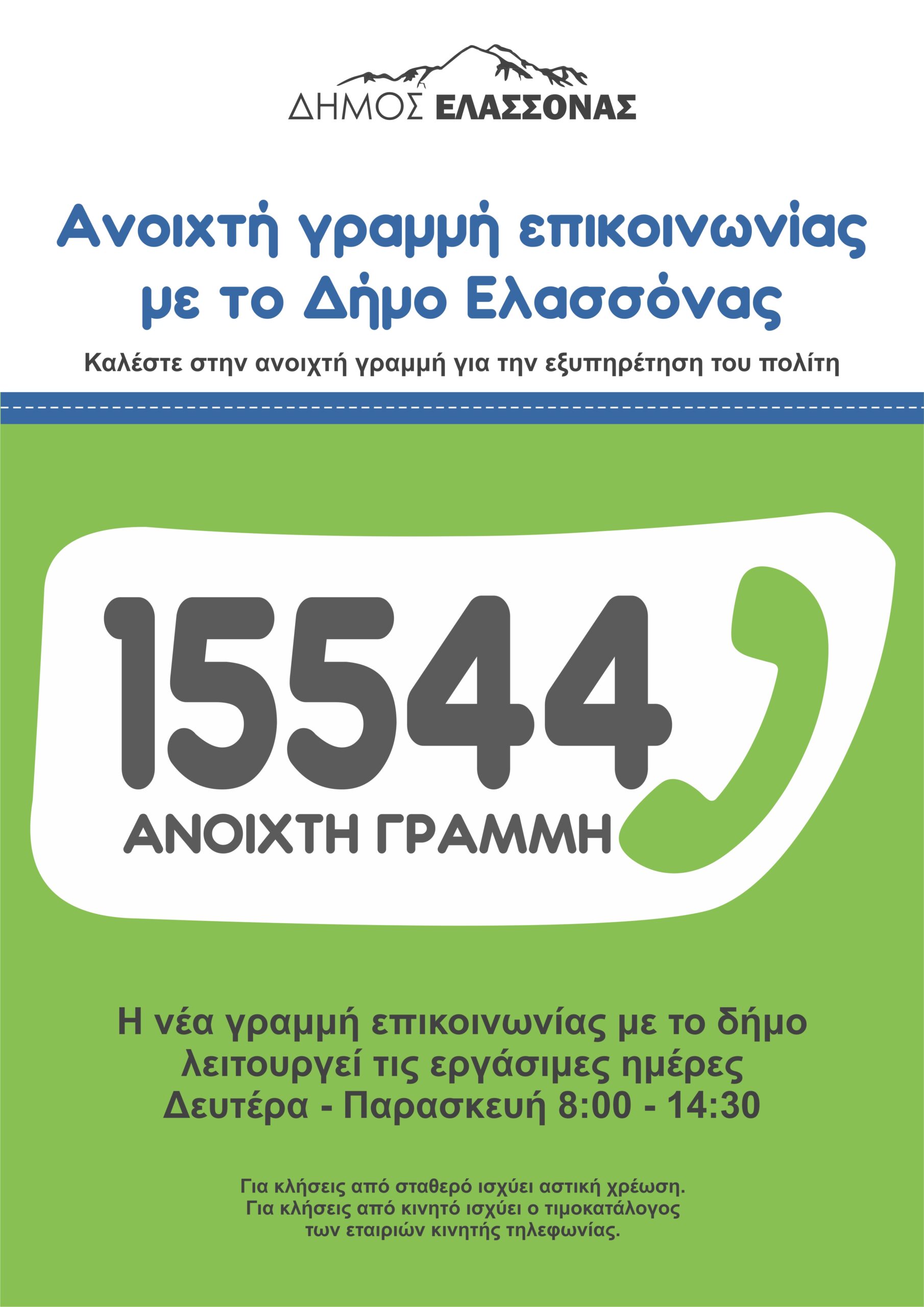 Για το λόγο αυτό έχει τεθεί σε λειτουργία η νέα ανοιχτή γραμμή επικοινωνίας με το Δήμο Ελασσόνας, το  πενταψήφιο νούμερο 15544, προκειμένου οι πολίτες να μπορούν να αναφέρουν προβλήματα για κάθε θέμα της καθημερινότητας που αποτελεί αρμοδιότητα του δήμου όπως: