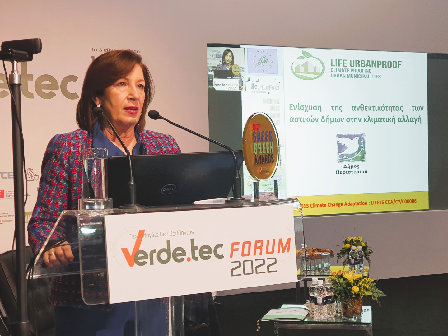 Το βραβείο παρέλαβε η Αντιδήμαρχος Περιβάλλοντος & Πολιτικής Προστασίας Μαίρη Τσιώτα – Μάρκου, η οποία τόνισε στην ομιλία της, ότι ο στόχος του περιβαλλοντικού έργου ήταν να αυξηθεί η ανθεκτικότητα του Δήμου Περιστερίου στην κλιματική αλλαγή, εξοπλίζοντάς τον με ένα ισχυρό εργαλείο (UrbanProof toolkit) για υποστήριξη στην λήψη καλύτερα ενημερωμένων αποφάσεων σχετικά με την κλιματική αλλαγή, καθώς και στον σχεδιασμό της προσαρμογής.