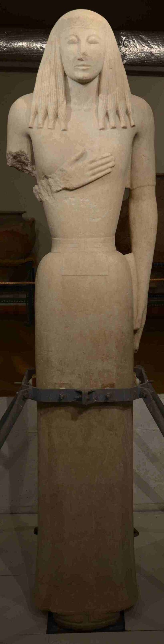 Η υπερφυσικού μεγέθους αρχαϊκή κόρη από λευκό ναξιώτικο μάρμαρο, ύψους 2,48 μ. με τον σύμφυτο γόμφο ένθεσης στη βάση του, είναι σχεδόν ακέραιη.