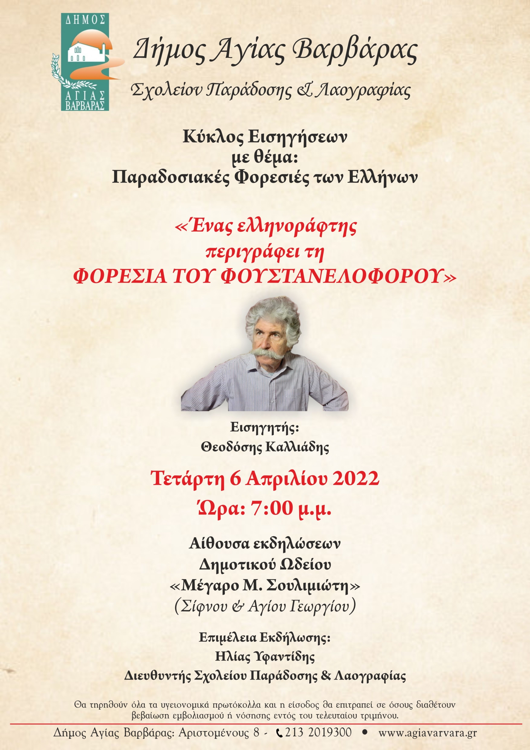 Κύκλο σεμιναρίων, για την ιστορία και τους συμβολισμούς των ελληνικών παραδοσιακών φορεσιών, οργανώνει το Σχολείον Παράδοσης και Λαογραφίας του Δήμου μας, με πρώτη παρουσίαση τη φορεσιά του φουστανελοφόρου