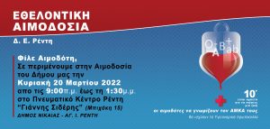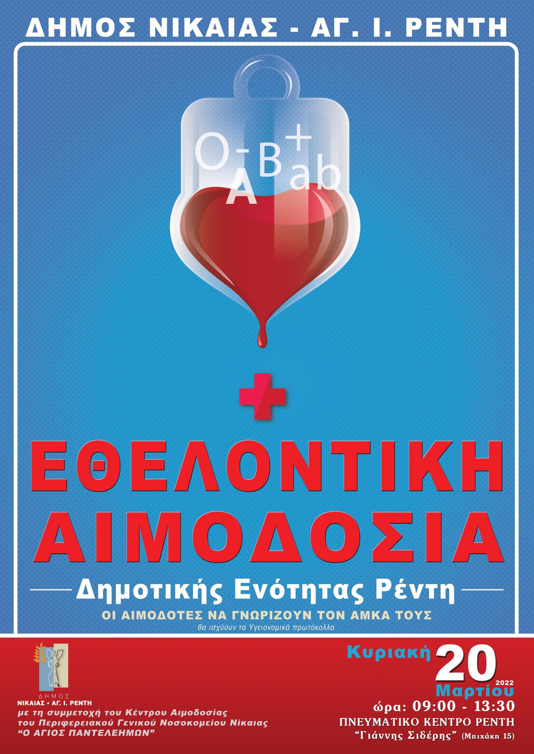 Εθελοντική αιμοδοσία διοργανώνει ο Δήμος Νίκαιας-Αγ.Ι. Ρέντη την Κυριακή 20 Μαρτίου από τις 9 το πρωί έως τη 1:30 μετά το μεσημέρι στο Πνευματικό Κέντρο Αγ.Ι. Ρέντη (Μπιχάκη 15) «Γιάννης Σιδέρης» (Μπιχάκη 15) με τη συμμετοχή του Κέντρου Αιμοδοσίας του Περιφερειακού Γενικού Νοσοκομείου Νίκαιας “ο Άγιος Παντελεήμων”.