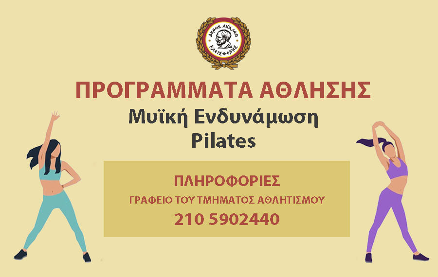 Ο Δήμος Αιγάλεω ανακοινώνει την έναρξη λειτουργίας νέων τμημάτων πιλάτες (μπάλα, λάστιχο, κοντάρι, ασκήσεις για αυχένα – μέση, ορθοσωμία κ.α.) και μυϊκής ενδυνάμωσης στην αίθουσα γυμναστικής του γηπέδου «Σταύρος Μαυροθαλασσίτης» (Θηβών 268).