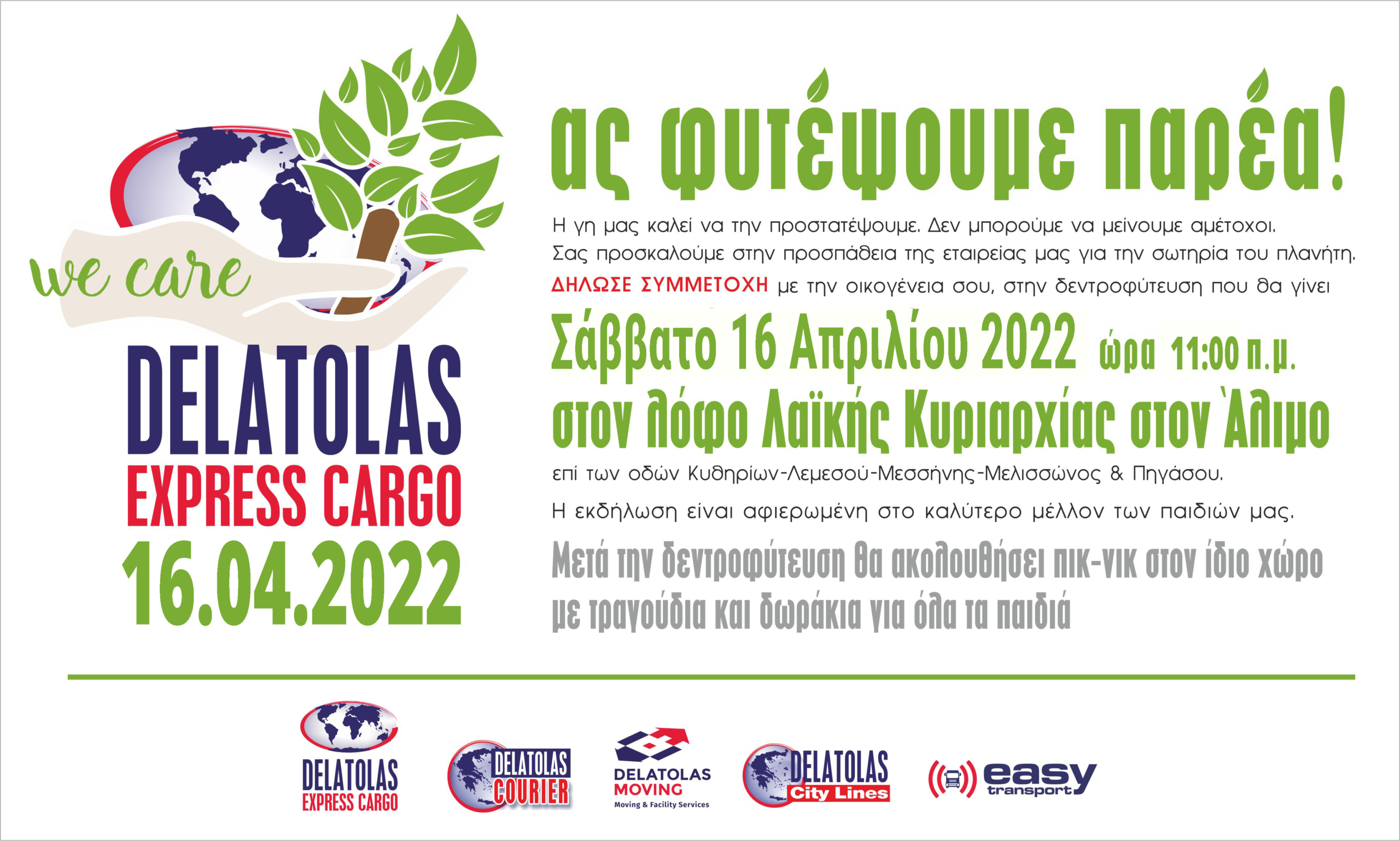 Όσοι θέλουν να βοηθήσουν εθελοντικά στη δενδροφύτευση, μπορούν να έρθουν με την παρέα τους ή την οικογένειά τους και να απολαύσουν μετά τη δράση ένα ανοιξιάτικο πικ-νικ με τραγούδια και δωράκια για τα παιδιά.