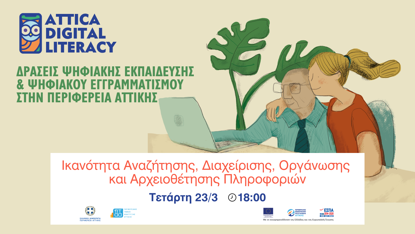 Σας περιμένουμε διαδικτυακά την Τετάρτη 23 Μαρτίου 2022 στις 18:00 σε ένα ακόμη webinar της δράσης, με θέμα «Ικανότητα Αναζήτησης, Διαχείρισης, Οργάνωσης και Αρχειοθέτησης Πληροφοριών» στο κανάλι YouTube και στη σελίδα Facebook του Ψηφιακού Εγγραμματισμού.