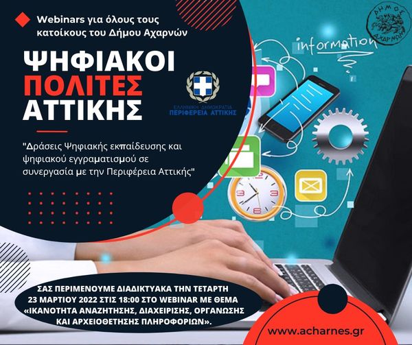 H Περιφέρεια Αττικής σε συνεργασία με το Δήμο Αχαρνών, στο πλαίσιο του έργου «Δράσεις Ψηφιακής Εκπαίδευσης και Ψηφιακού Εγγραμματισμού» (Επιχειρησιακό Πρόγραμμα «Αττική 2014-2020») διοργανώνουν κύκλο δωρεάν διαδικτυακών σεμιναρίων (webinars) για την ενημέρωση ενηλίκων (18+) γονέων και κηδεμόνων, στελεχών της δημόσιας και τοπικής διοίκησης αλλά και του ιδιωτικού τομέα, επιχειρηματιών, μελών οργανώσεων του ευρύτερου τομέα και όλων των δημοτών , σχετικά με υπηρεσίες, εργαλεία και μεθόδους για την ασφαλή και αποτελεσματική χρήση του διαδικτύου.