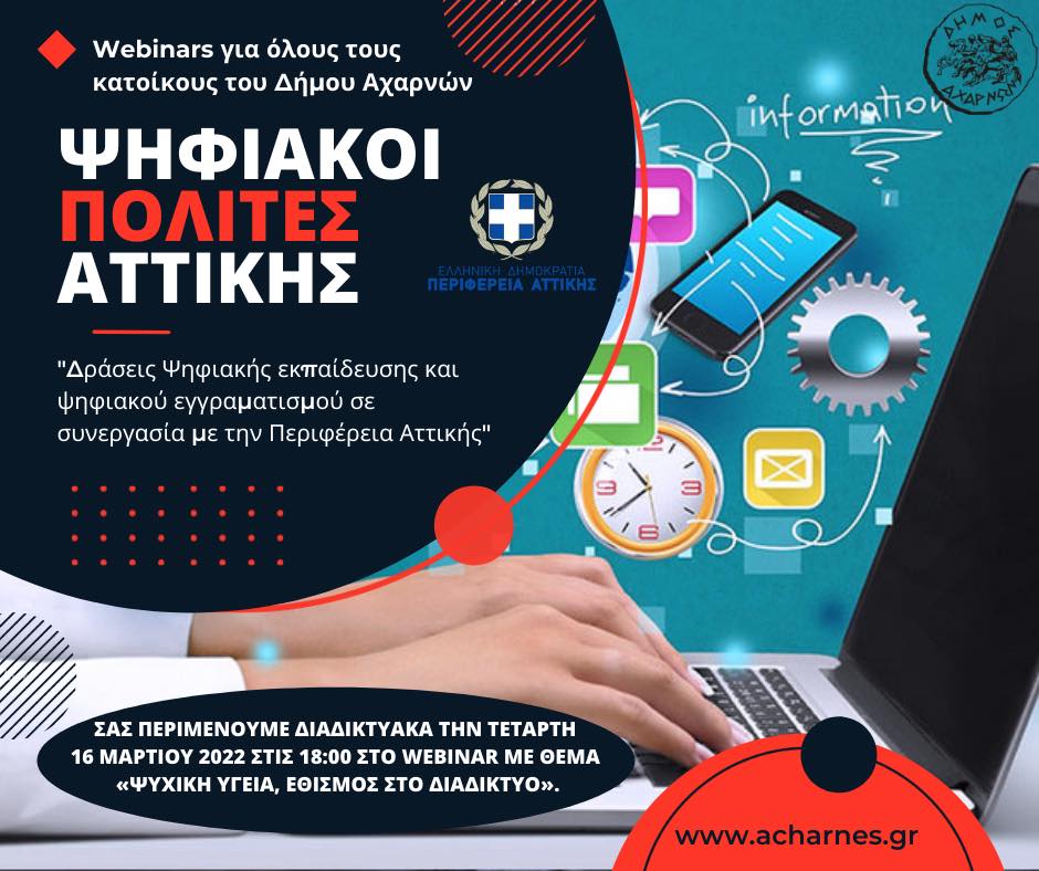 Σας προσκαλούμε την Τετάρτη 16 Μαρτίου 2022 στις 18:00 στο webinar με θέμα «Ψυχική Υγεία, Εθισμός στο Διαδίκτυο», το οποίο θα μεταδοθεί ζωντανά μέσα από το κανάλι μας στο YouTube (https://tinyurl.com/atticadigital) και στη σελίδα μας στο Facebook (https://www.facebook.com/digital.attiki).