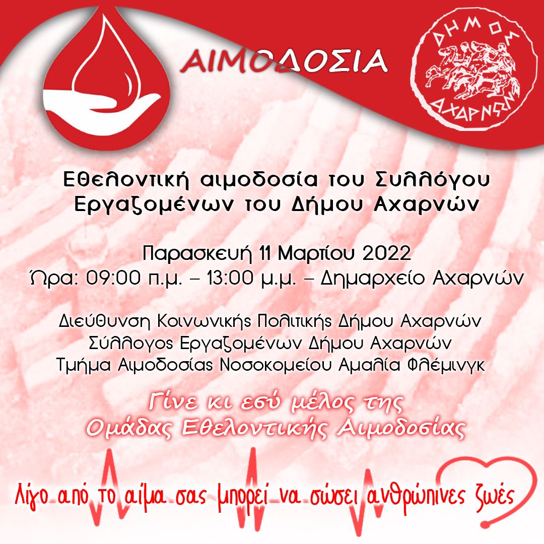 Ανακοινώνουμε στους κατοίκους του Δήμου Αχαρνών ότι την Παρασκευή 11 Μαρτίου στο Δημαρχείο Αχαρνών από 09:00-13:00 θα πραγματοποιηθεί, στο χώρο του Δημαρχείου, Εθελοντική Αιμοδοσία από τη Διεύθυνση Κοινωνικής Πολιτικής και τον Σύλλογο Εργαζομένων του Δήμου Αχαρνών σε συνεργασία με το Τμήμα Αιμοδοσίας του Νοσοκομείου Αμαλία Φλέμινγκ.