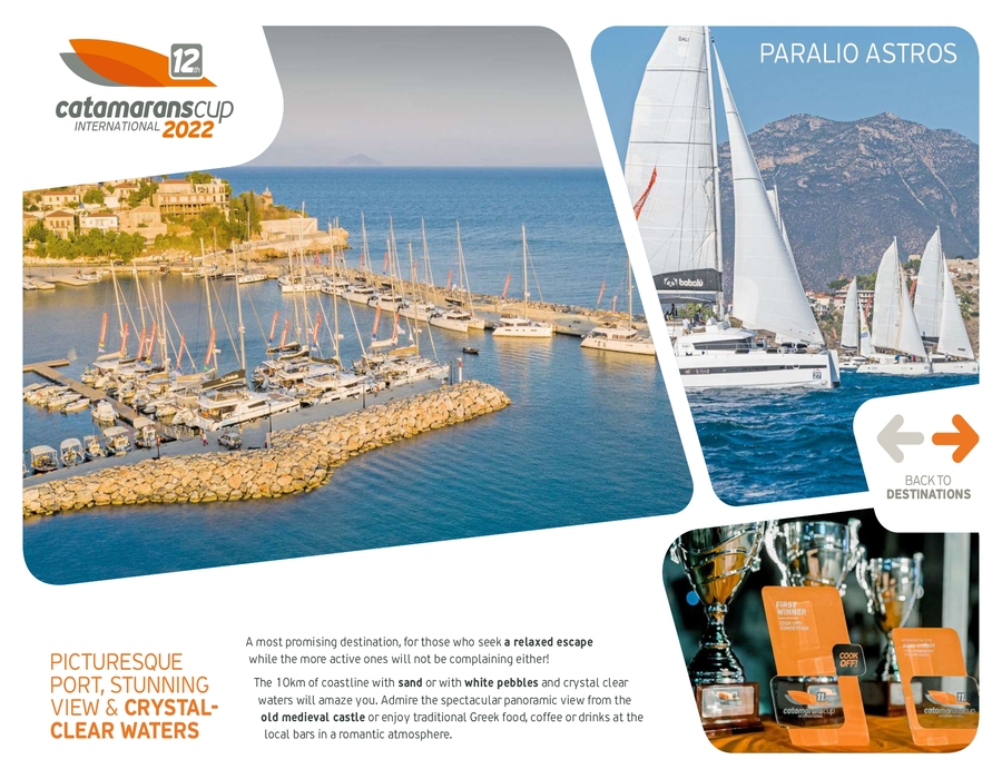 Το 12ο Catamarans Cup Ιnternational έχει τεθεί υπό την Αιγίδα του ΕΟΤ και ξεκίνησε στις 23 Οκτωβρίου από τον Άλιμο ενώ η λήξη θα λάβει χώρα την 29η Οκτωβρίου. Στον αγώνα συμμετέχουν 25 σκάφη με 250 συμμετέχοντες από 10 χώρες. Τα σκάφη θα καταπλεύσουν στο λιμάνι του Παράλιου Άστρους την Τρίτη 25/10/2022 κατά τις απογευματινές ώρες. Θα ακολουθήσει η γιορτή προς τιμή των συμμετεχόντων, ενώ η αναχώρηση από το λιμάνι έχει προγραμματιστεί για την Τετάρτη 26/10/2022.