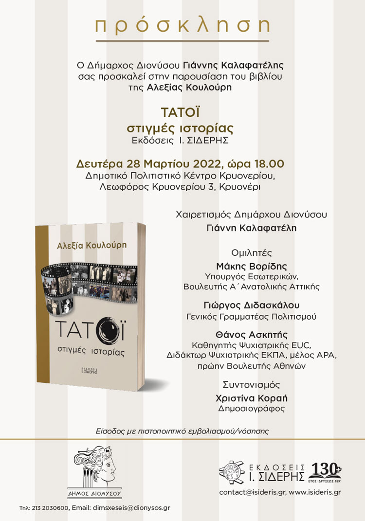 Ο Δήμος Διονύσου σας προσκαλεί στην παρουσίαση του βιβλίου της γνωστής δημοσιογράφου Αλεξίας Κουλούρη με τίτλο «ΤΑΤΟΪ στιγμές ιστορίας» από τις Εκδόσεις Ι. ΣΙΔΕΡΗΣ.