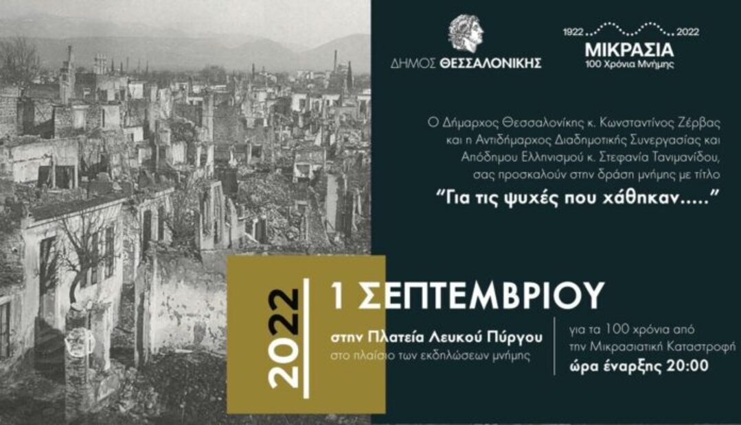 «Για τις ψυχές που χάθηκαν…» είναι ο τίτλος της δράσης μνήμης που οργανώνουν ο Δήμος Θεσσαλονίκης και η Aντιδημαρχία Διαδημοτικής Συνεργασίας και Απόδημου Ελληνισμού την Πέμπτη 1 Σεπτεμβρίου, στις 20.00, στην πλατεία Λευκού Πύργου, στο πλαίσιο των επετειακών εκδηλώσεων για τα 100 χρόνια από τη Μικρασιατική Καταστροφή.
