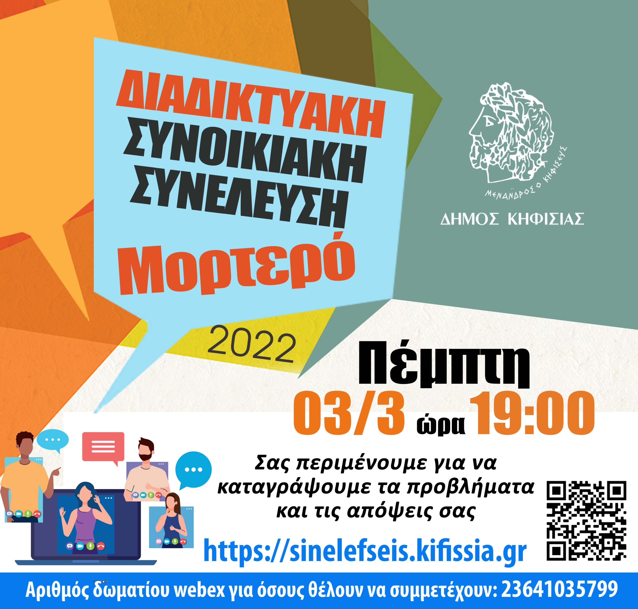 Η επόμενη προγραμματισμένη Συνοικιακή Συνέλευση είναι προγραμματισμένη για σήμερα (3/3) και ώρα 19.00 μέσω της εφαρμογής https://sinelefseis.kifissia.gr/ (Αριθμός δωματίου webex 23641035799) για τους κατοίκους της περιοχής Μορτερό.