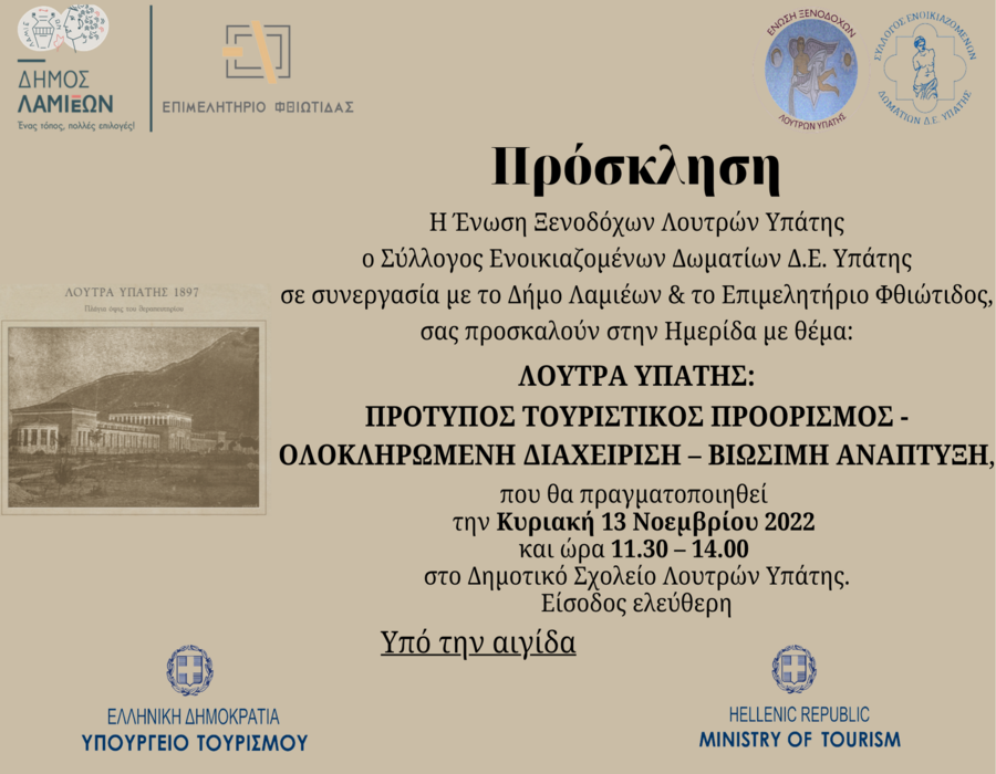 H Ένωση Ξενοδόχων Λουτρών Υπάτης και ο Σύλλογος Ενοικιαζόμενων Δωματίων Δ.Ε. Υπάτης, σε συνεργασία με το Δήμο Λαμιέων και το Επιμελητήριο Φθιώτιδας, σας προσκαλούν στην ημερίδα με θέμα «Λουτρά Υπάτης: Πρότυπος Τουριστικός Προορισμός – Ολοκληρωμένη Διαχείριση – Βιώσιμη Ανάπτυξη», που θα πραγματοποιηθεί την Κυριακή 13 Νοεμβρίου 2022 και ώρα 11.30 έως 14.00, στο Δημοτικό Σχολείο Λουτρών Υπάτης.
