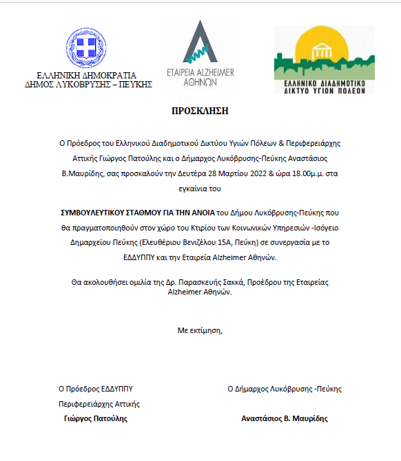 Τα εγκαίνια θα πραγματοποιηθούν από τον Περιφερειάρχη Αττικής και Πρόεδρο του Εθνικού Διαδημοτικού Δικτύου Υγιών Πόλεων-Προαγωγής Υγείας (ΕΔΔΥΠΠΥ) Γιώργο Πατούλη Γιώργο και τον Δήμαρχο Λυκόβρυσης-Πεύκης και Γενικό Γραμματέα της ΠΕΔ Αττικής Τάσο Μαυρίδη. Θα ακολουθήσει ομιλία της Πρόεδρου της Εταιρείας Alzheimer Αθηνών Δρ. Παρασκευής Σακκά.