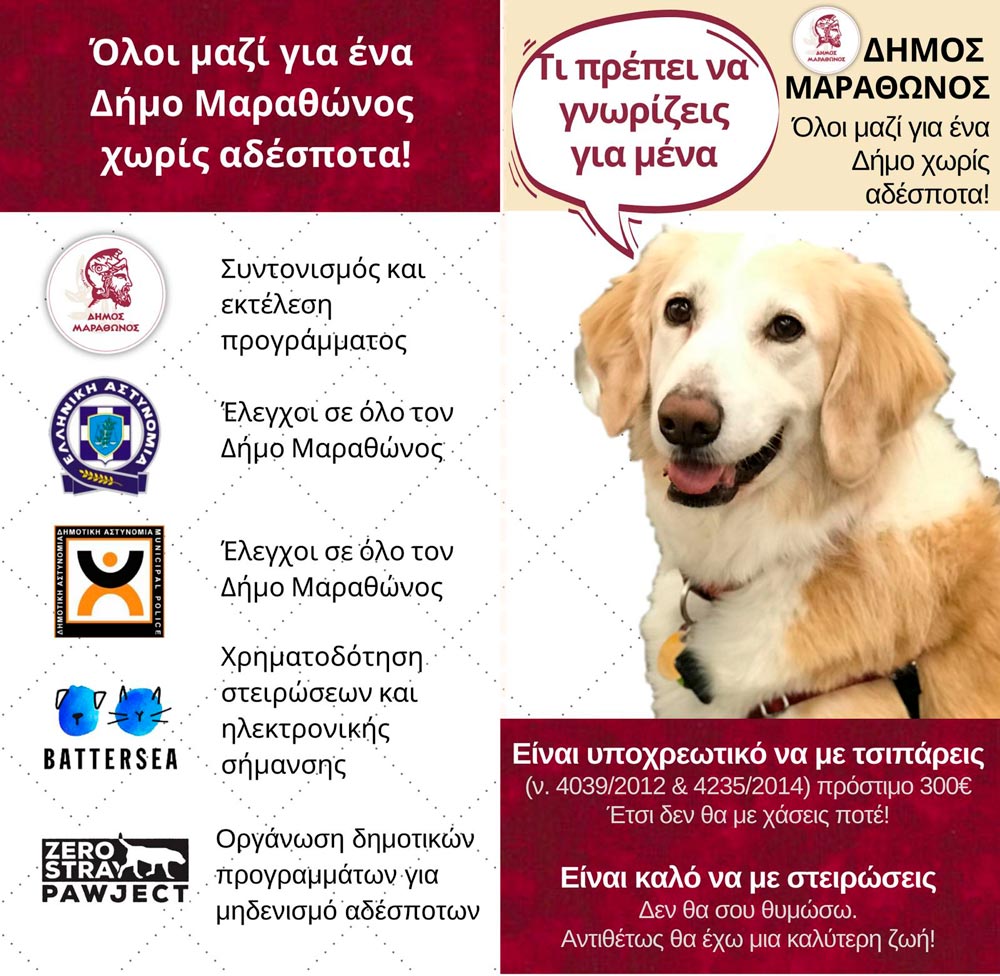 Παγκόσμια ημέρα αδέσποτων ζώων σήμερα και ο Δήμος Μαραθώνος ιδιαίτερα ευαισθητοποιημένος και πρωτοπόρος, στο πλαίσιο της προσπάθειας μείωσης των αδέσποτων, συνεχίζει το πρόγραμμα επιχορήγησης στείρωσης και τσιπαρίσματος δεσποζόμενων σκύλων μέσω της Zero Stray Pawject, Inc με χρηματοδότηση της φιλοζωικής οργάνωσης του Ηνωμένου Βασιλείου Battersea Dogs and Cats Home, δίνει την δυνατότητα υιοθεσίας και αναδοχής αδέσποτων στους δημότες, ενώ πραγματοποιεί και συνεχείς ελέγχους σε ιδιοκτήτες.