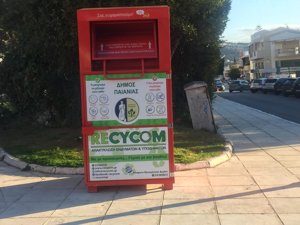 Οι κόκκινοι κάδοι είναι αποτέλεσμα της συνεργασίας του Δήμου Παιανίας με την RECYCOM, η οποία έχει και την ευθύνη συντήρησης και αποκομιδής τους.