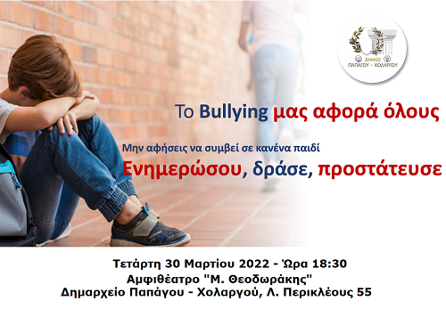 Ο Δήμος Παπάγου – Χολαργού σας προσκαλεί στην εκδήλωση με θέμα «Το Bullying μας αφορά όλους. Ενημερώσου, δράσε, προστάτευσε», την Τετάρτη 30 Μαρτίου και ώρα 18:30, στο Αμφιθέατρο «Μ. Θεοδωράκης» του Δημαρχείου (Λ. Περικλέους 55, Χολαργός).