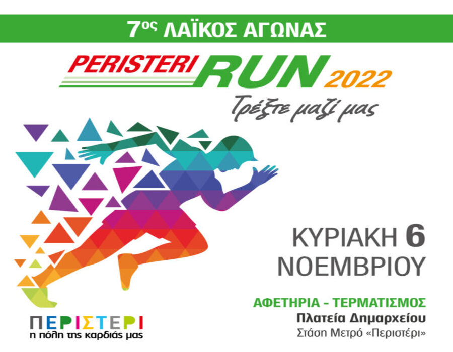 Την Κυριακή 6 Νοεμβρίου 2022 το πρωί θα διεξαχθεί ο 7ος Λαϊκός Αγώνας «Peristeri Run» με αφετηρία και τερματισμό την πλατεία Δημαρχείου (Δημοκρατίας) – στάση Μετρό «Περιστέρι. Ώρα προσέλευσης 7:30 για τους συμμετέχοντες ενήλικες και παιδιά.