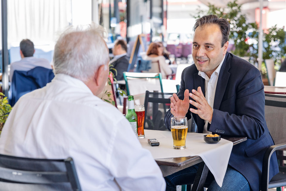Η συζήτηση έγινε στον «Ζύθο Ντορέ», απέναντι από τον Λευκό Πύργο, απογευματάκι. Ηπιαμε από μία μπίρα, «κανονική» εκείνος, άνευ αλκοόλ εγώ. Αλλιώς είχε ονειρευτεί το «μενού», όπως μου είπε: Στα Τρίκαλα με «έξυπνα» τσίπουρα, τυριά, και κοψίδια. Επιφυλάχτηκε να ανταποδώσει. Την έβγαλα φθηνά, με μόλις 8,5 ευρώ.