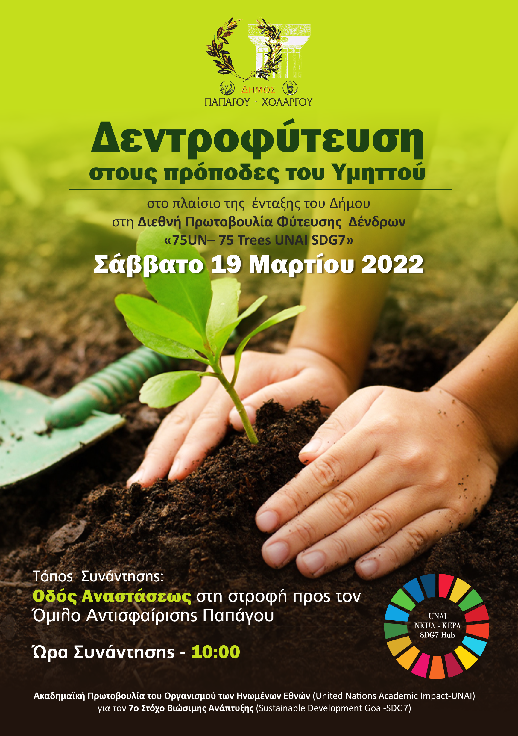 Η δεντροφύτευση πραγματοποιείται στο πλαίσιο της ένταξης του Δήμου στη Διεθνή Πρωτοβουλία Φύτευσης Δένδρων «75UN– 75 Trees UNAI SDG7» και σας περιμένουμε όλους, μικρούς και μεγάλους.