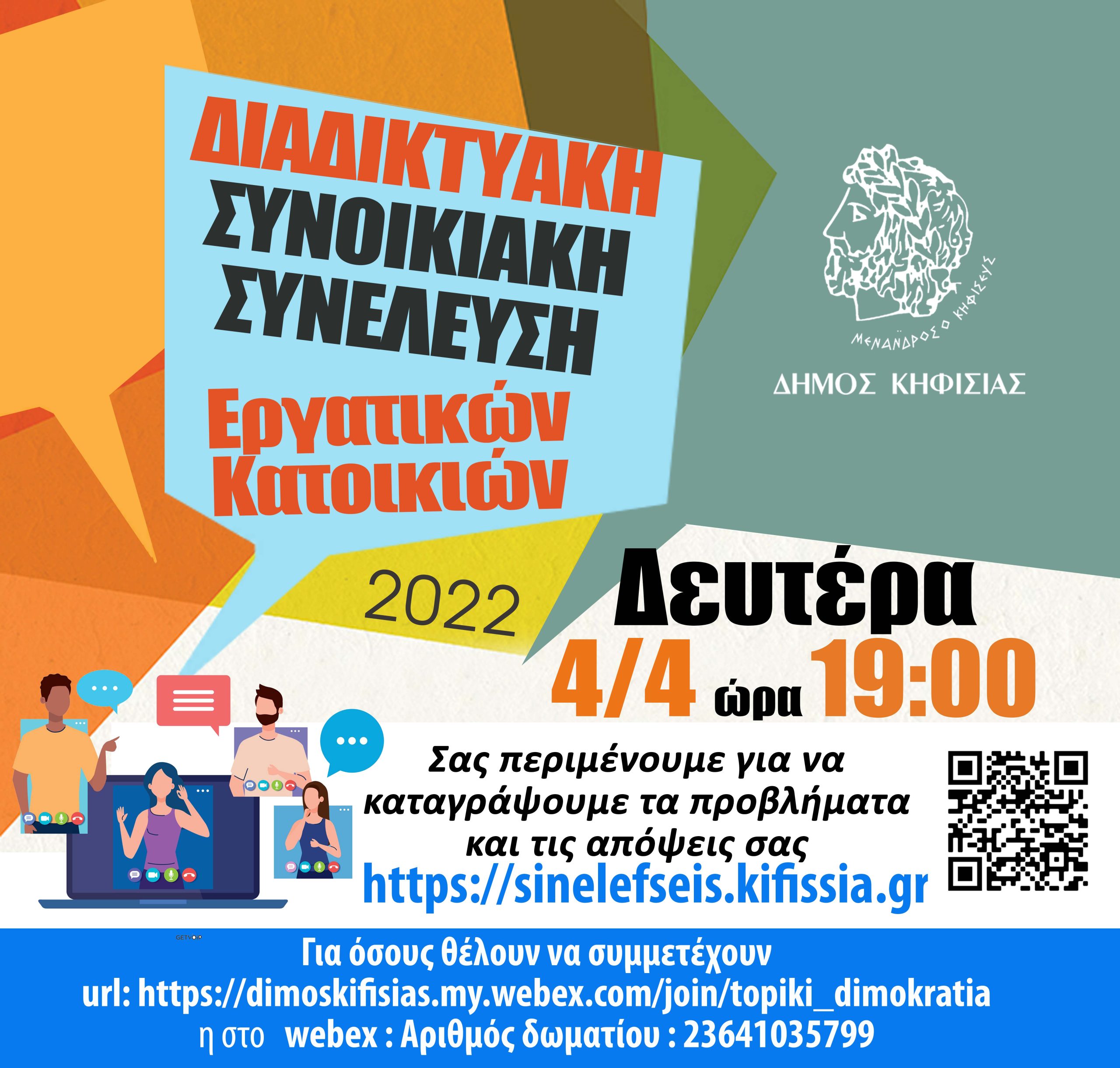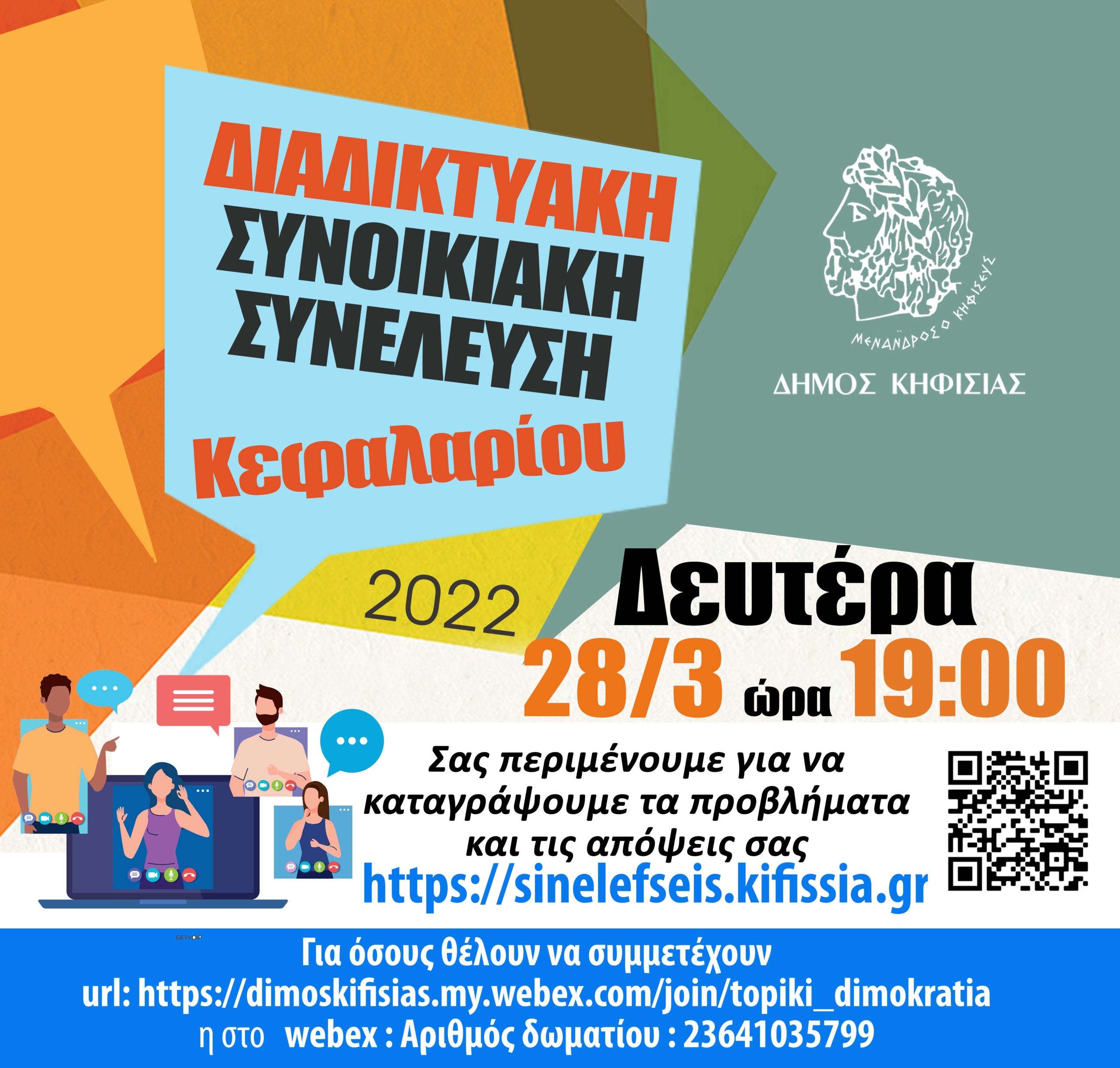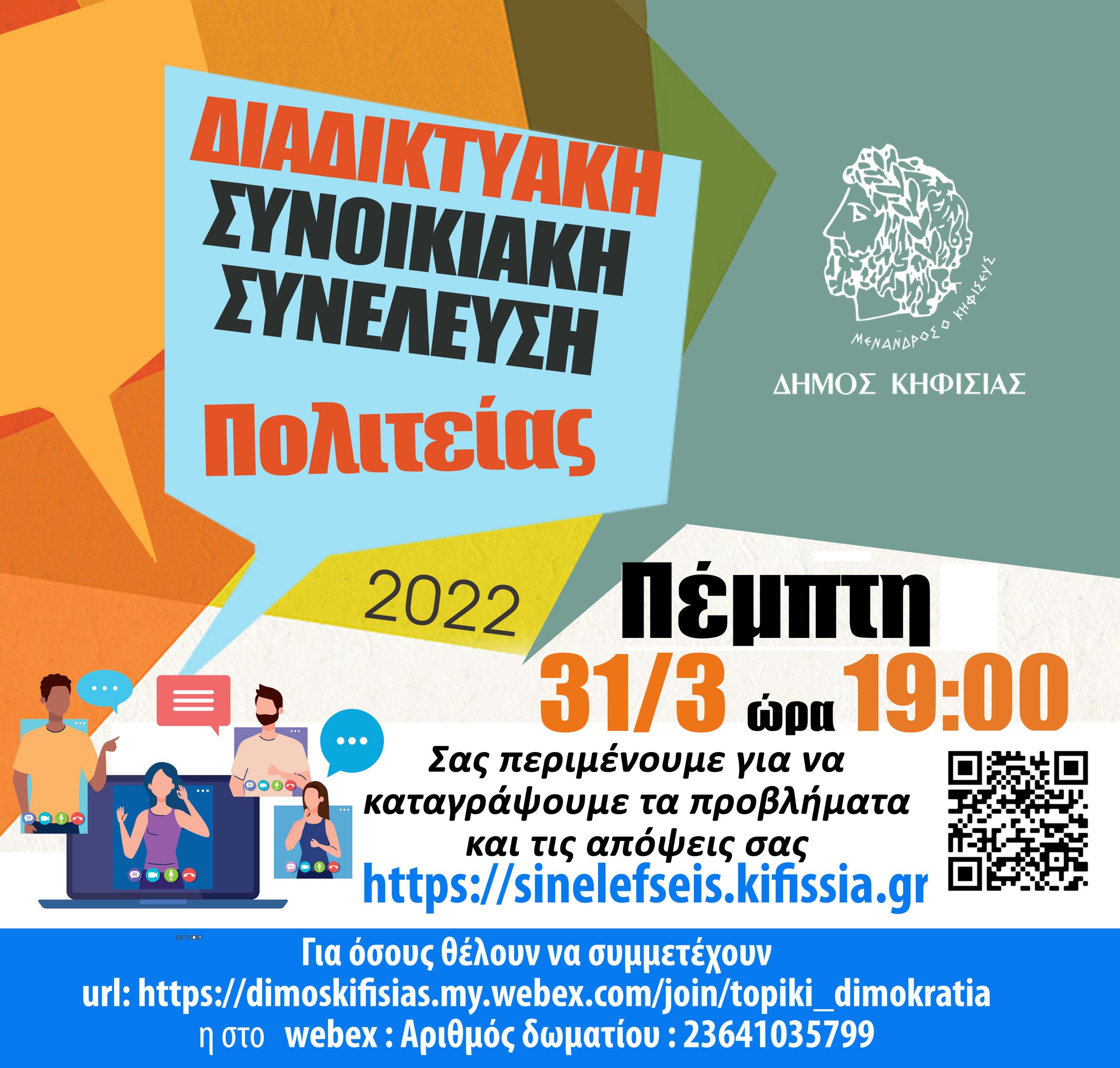 μέσω της εφαρμογής https://sinelefseis.kifissia.gr/ (Αριθμός δωματίου webex 23641035799) ή https://dimoskifisias.my.webex.com/join/topiki_dimokratia
