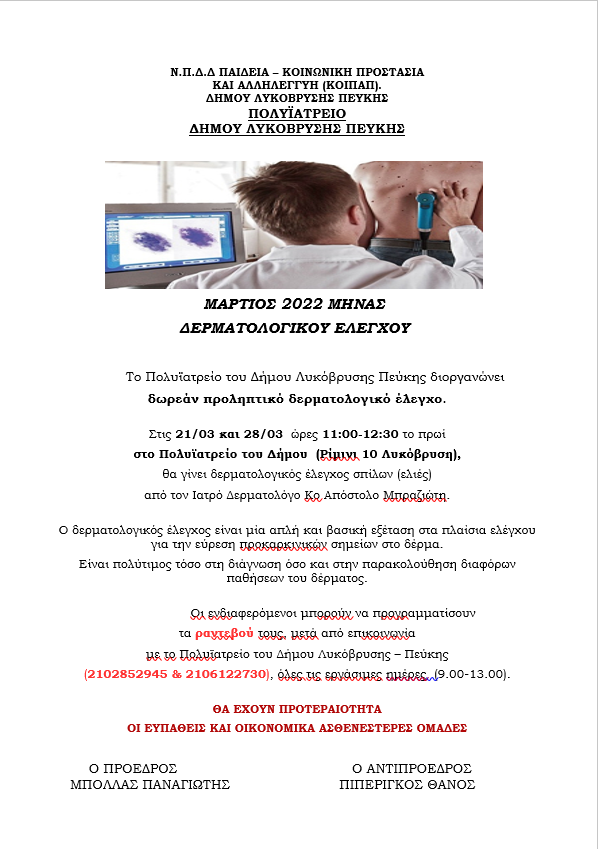 Για το ΚΟΙΠΑΠ του Δήμου Λυκόβρυσης- Πεύκης ο Μάρτιος 2022 είναι Μήνας Δερματολογικού Ελέγχου. Στις 21/03 και 28/03 ώρες 11:00-12:30 το πρωί στο Πολυϊατρείο του Δήμου (Ρίμινι 10 Λυκόβρυση), θα γίνει δερματολογικός έλεγχος σπίλων (ελιές) από τον Ιατρό Δερματολόγο Απόστολο Μπραζιώτη.