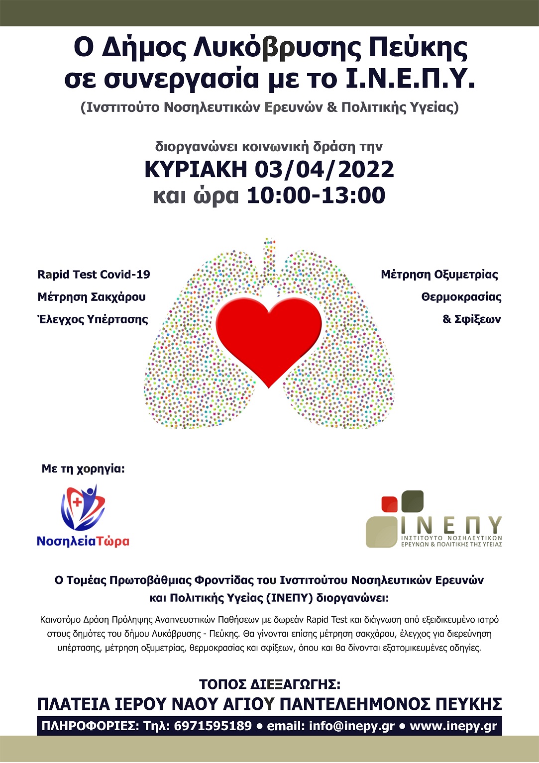 Ο Δημος Λυκόβρυσης- Πεύκης σε συνεργασία με το Ινστιτούτο Νοσηλευτικών Ερευνών και Πολιτικής Υγείας (ΙΝΕΠΥ) διοργανώνει κοινωνική δράση πρόληψης αναπνευστικών παθήσεων στην Πλατεία Ιερού Ναού Αγίου Παντελεήμονα Πεύκης την Κυριακή 3 Απριλίου και ώρα 10:00-13:00.
