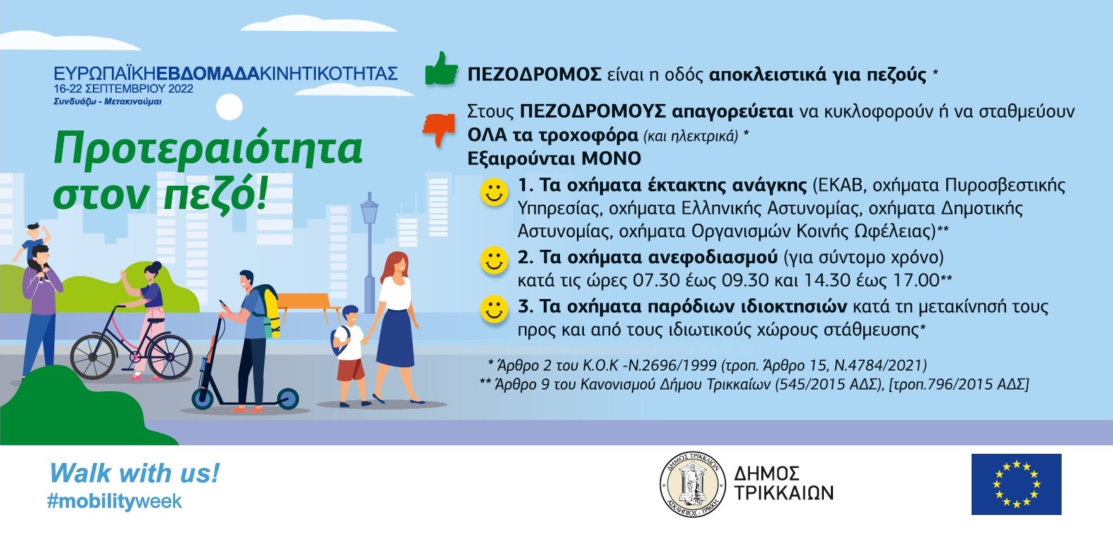 Στο πλαίσιο της Ευρωπαϊκής Εβδομάδας Κινητικότητας 2022 ο Δήμος Τρικκαίων ξεκίνησε μια εβδομαδιαία εκστρατεία, προκειμένου οι κάτοικοι των Τρικάλων να τηρούν περισσότερο τη νομιμότητα σε σχέση με το ποιος (ποιο όχημα) κυκλοφορεί σε ποδηλατόδρομο και πεζόδρομο.