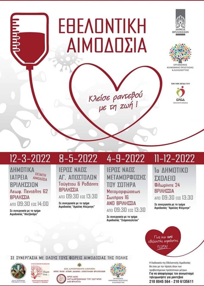 Νέα προγραμματισμένη Εθελοντική Αιμοδοσία στο Δήμο Βριλησσίων, την Κυριακή 8 Μαίου 2022, μέσω του Οργανισμού Κοινωνικής Προστασίας & Αλληλεγγύης πάντα σε συνεργασία με τους φορείς αιμοδοσίας της πόλης.