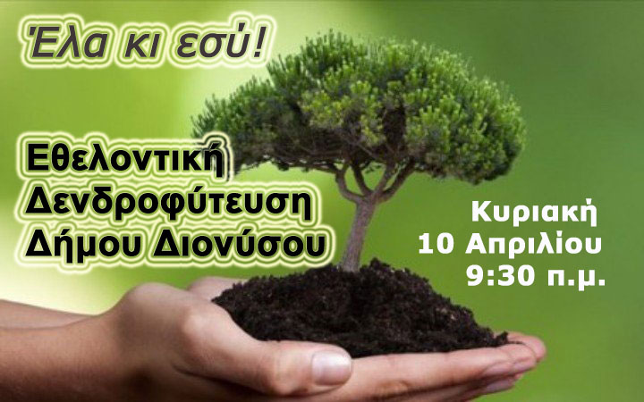 Ο Δήμος Διονύσου στο πλαίσιο της συνεχιζόμενης προσπάθειάς του να ενδυναμώσει το φυσικό πλούτο της περιοχής μας, διοργανώνει Εθελοντική Δενδροφύτευση σε πληγείσες περιοχές από τις καταστροφικές πυρκαγιές του καλοκαιριού και απευθύνει πρόσκληση συμμετοχής προς πολίτες, σχολεία, τοπικούς φορείς αλλά και επιχειρήσεις.