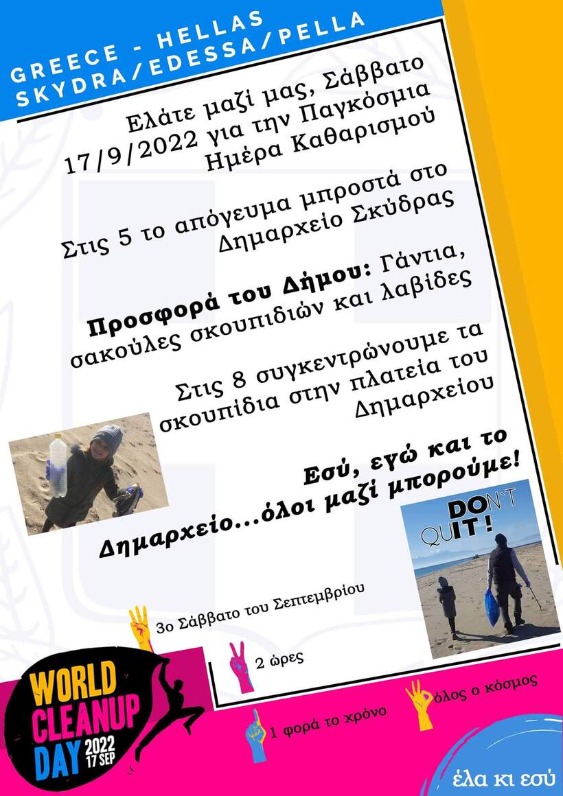 Στο πλαίσιο της Παγκόσμιας Ημέρας Καθαριότητας που πραγματοποιείται το Σάββατο 17 Σεπτεμβρίου 2022, ο Δήμος Σκύδρας κι εθελοντές της περιοχής πρόκειται να υλοποιήσουν την ημέρα αυτή περιβαλλοντική δράση καθαριότητας σε σημεία της πόλης της Σκύδρας.