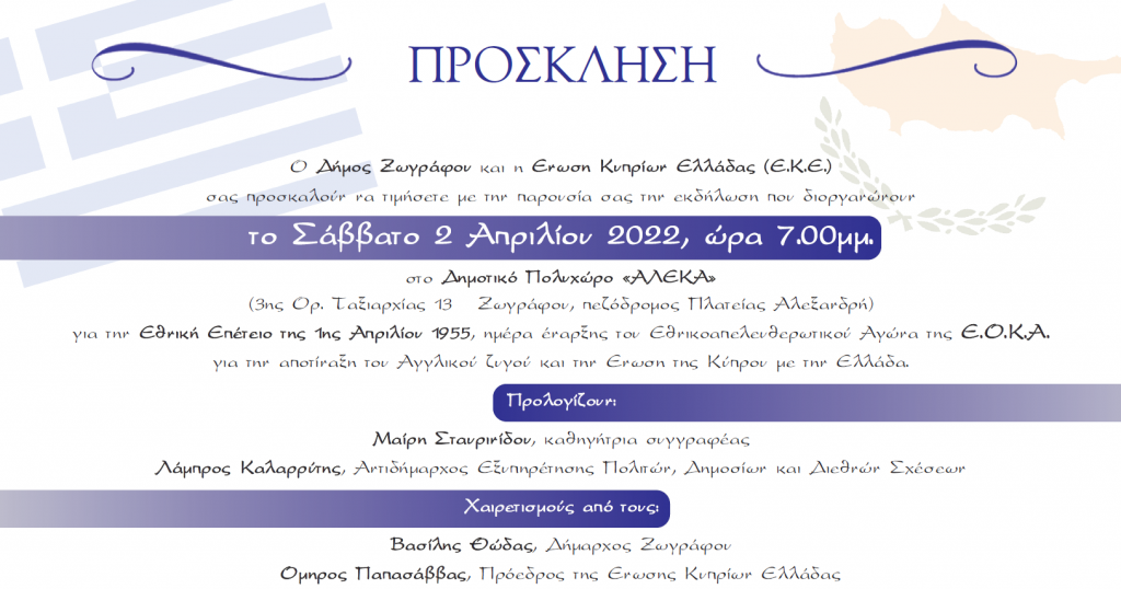 Ο Δήμος Ζωγράφου και η Ένωση Κυπρίων Ελλάδος, με αφορμή την εθνική επέτειο της 1ης Απριλίου 1955, ημέρα έναρξης του Εθνικοαπελευθερωτικού Αγώνα της Ε.Ο.Κ.Α. για την αποτίναξη του Αγγλικού ζυγού και την Ένωση της Κύπρου με την Ελλάδα, σας προσκαλούν στην εκδήλωση που διοργανώνουν στον Δημοτικό Πολιτιστικό Πολυχώρο «Αλέκα» (Γ΄ Ορεινής Ταξιαρχίας 13), το Σάββατο 2 Απριλίου 2022, στις 7:00μ.μ. .
