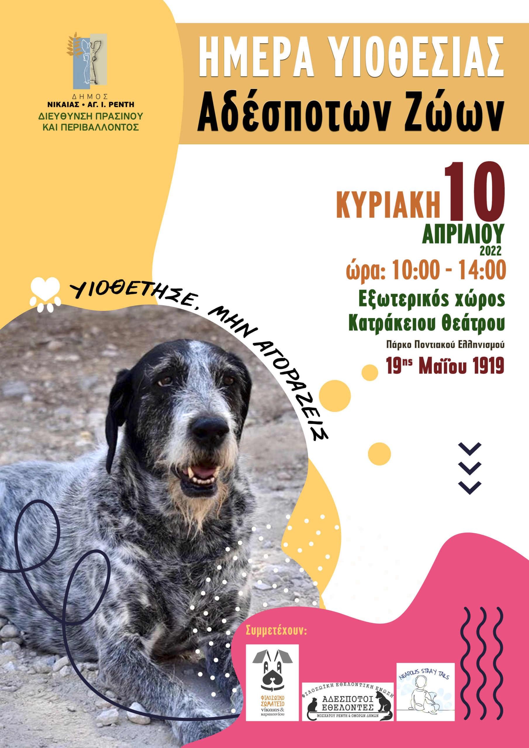 Ημερίδα για την υιοθεσία αδέσποτων ζώων θα πραγματοποιηθεί την Κυριακή 10 Απριλίου 2022 στο πάρκο του Ποντιακού Ελληνισμού -19ης Μαΐου 1919, που βρίσκεται στον εξωτερικό χώρο του Κατράκειου Θεάτρου και διοργανώνεται από τη Διεύθυνση Πρασίνου και Περιβάλλοντος του Δήμου από τις 10 το πρωί έως τις 2 μετά το μεσημέρι.