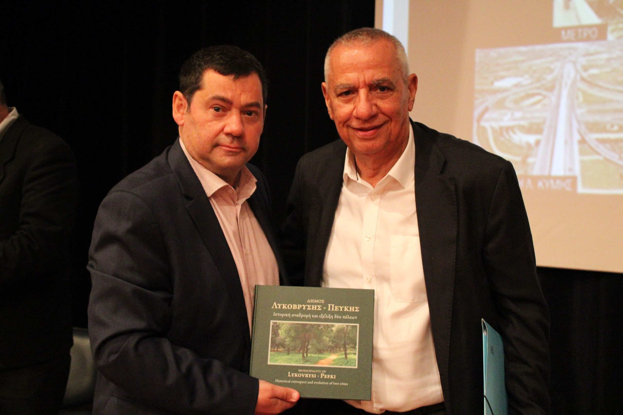 Στην εκδήλωση απηύθυνε χαιρετισμό ο Δήμαρχος Λυκόβρυσης – Πεύκης κ. Τάσος Μαυρίδης, ο οποίος αφού τόνισε την σημασία της συνεργασίας των Δήμων και των Φορέων και στον τομέα αυτό, παρουσίασε συνοπτικά τις παρεμβάσεις του Δήμου του στον προγραμματισμό των μεγάλων Μητροπολιτικών έργων που αφορούν στην περιοχή. Ο κ. Μαυρίδης δήλωσε σχετικά: «Είχαμε τη χαρά να συνδιοργανώσουμε με τον Σ.Β.Α.Π. και να φιλοξενήσουμε στο Δημοτικό μας Θέατρο μια πολύ σημαντική εκδήλωση, καθώς ακούσαμε τις απόψεις των ειδικών και συζητήσαμε για τα μεγάλα έργα της ευρύτερης περιοχής. Οι εκπρόσωποι της Αυτοδιοίκησης βρισκόμαστε σε συνεννόηση μεταξύ μας και διεκδικούμε προκειμένου τα έργα που δρομολογούνται να λειτουργήσουν υπέρ των πολιτών των Δήμων μας». Ο κ. Μαυρίδης παρέδωσε το βιβλίο που εξέδωσε ο Δήμος και παρουσιάζει την ιστορία του στον Πρόεδρο της Ένωσης Δημάρχων Αττικής και τέως Δήμαρχο Πεύκης κ. Παύλο Καμάρα, στον Προέδρο του Σ.Β.Α.Π. κ. Γιώργο Κουράση, στον Πρόεδρο του Πράσινου Ταμείου κ. Στάθη Σταθόπουλο, στον Διευθύνοντα Σύμβουλο της ΑΤΤΙΚΟ ΜΕΤΡΟ κ. Νίκο Κουρέτα, στον Περιφερειακό Σύμβουλο κ. Νίκο Παπαδάκη και στον Καθηγητή κ. Κωνσταντίνο Κεπαπτσόγλου.