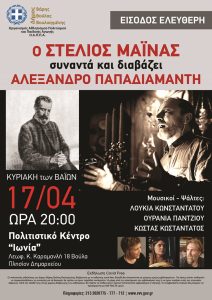 Μουσικοθεατρική παράσταση με τίτλο «Ο Στέλιος Μάϊνας συναντά τον Αλέξανδρο Παπαδιαμάντη» στο Πολιτιστικό Κέντρο «Ιωνία» (Λεωφ. Κ. Καραμανλή 18 Βούλα, πλησίον Δημαρχείου).