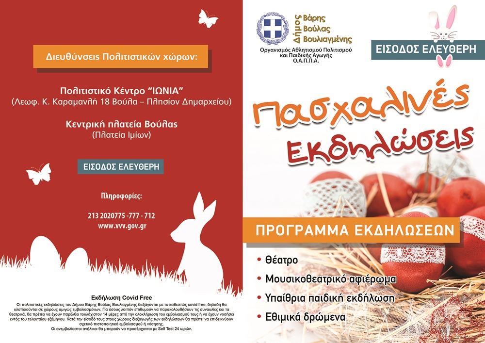 Με 3 ξεχωριστές εκδηλώσεις υποδέχεται ο Δήμος Βάρης Βούλας Βουλιαγμένης το Πάσχα του 2022, με ένα μοναδικό πρόγραμμα με θέατρο, μουσική, παραδοσιακά έθιμα και χορό, καλλιτεχνικά εργαστήρια και παιχνίδια για μικρούς και μεγάλους, υπό την επιμέλεια του Οργανισμού Αθλητισμού Πολιτισμού και Παιδικής Αγωγής (Ο.Α.Π.Π.Α).