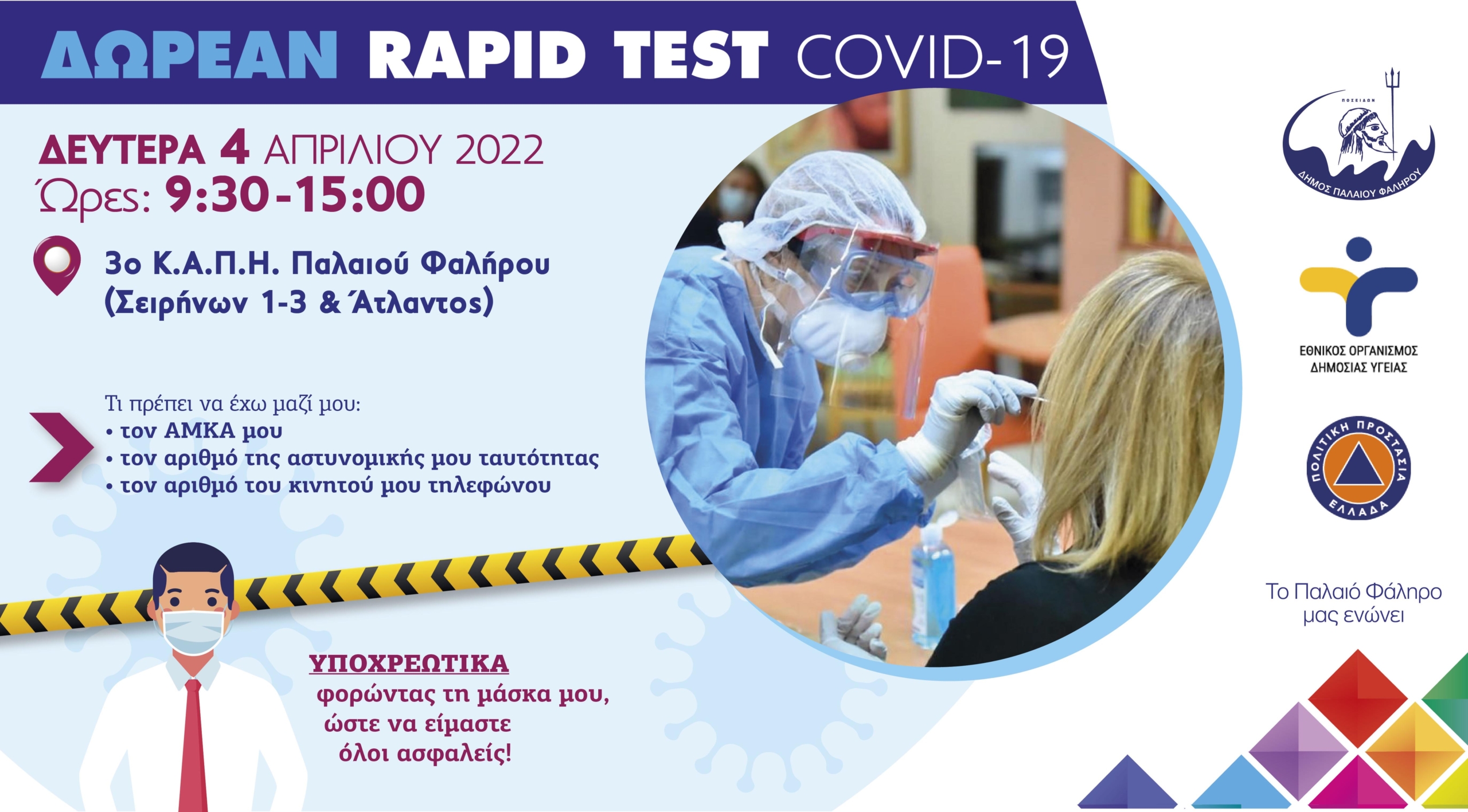 Ο Δήμος Παλαιού Φαλήρου, σε συνεργασία με τον Ε.Ο.Δ.Υ., θα διενεργήσει νέο δωρεάν rapid test COVID-19, την Δευτέρα 4/4/2022, από τις 09:30 π.μ. έως 15.00 μ.μ., στο 3ο Κ.Α.Π.Η. Παλαιού Φαλήρου (Σειρήνων 1-3 & Άτλαντος).