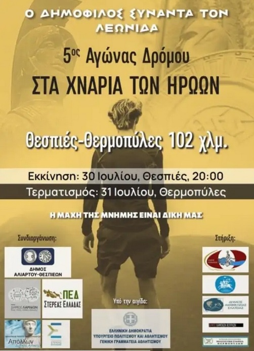 Με την καθιερωμένη εκκίνηση από το άγαλμα του Δημόφιλου στις Θεσπιές το Σάββατο 30 Ιουλίου, και ώρα 8 το βράδυ , ξεκινάει ο 5ος ιστορικός αγώνας δρόμου υπερ – απόστασης 102 χιλιομέτρων «Στα χνάρια των ηρώων» καθώς και δυο σκυταλοδρομίες 2 και 4 αθλητών, οι οποίοι είναι αφιερωμένοι στην μνήμη των 700 Θεσπιέων που έπεσαν στη Μάχη των Θερμοπυλών, μαζί με τους 300 Σπαρτιάτες. Οι αγώνες τερματίζουν στο ιστορικό πεδίο των Θερμοπυλών την Κυριακή 31 Ιουλίου.