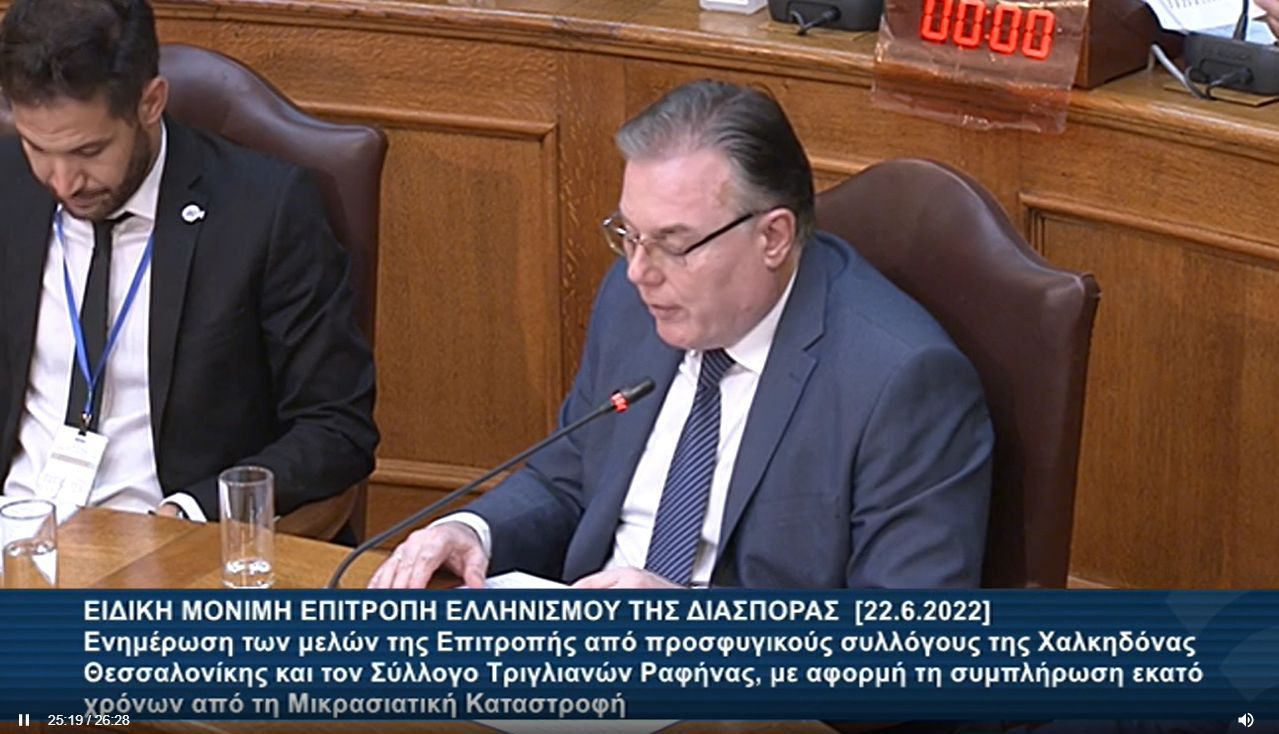 Σε συνεδρίαση της Επιτροπής Ελληνισμού της Διασποράς της Βουλής παρέστησαν ο Δήμαρχος Χαλκηδόνος, Σταύρος Αναγνωστόπουλος, ο Αντιδήμαρχος Πολιτισμού, Ανέστης Ανεστίδης και αντιπροσωπεία Προσφυγικών Συλλόγων του Δήμου Χαλκηδόνος μετά από πρόσκληση του Προέδρου της Επιτροπής Ελληνισμού της Διασποράς και Βουλευτή της ΝΔ Β’ Θεσσαλονίκης, Σάββα Αναστασιάδη με αφορμή τη συμπλήρωση εκατό χρόνων από τη Μικρασιατική Καταστροφή.