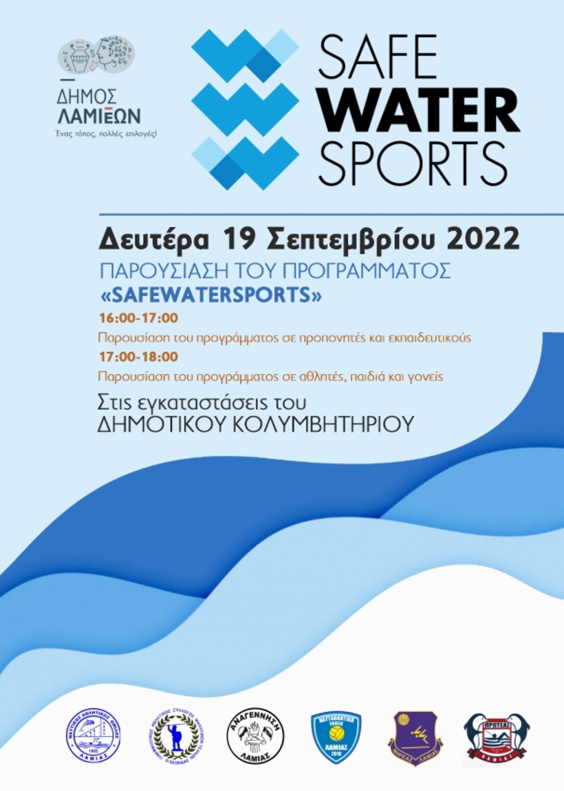 Ο Δήμος Λαμιέων, σε συνεργασία με τους συλλόγους υγρού στίβου της πόλης, ανέλαβε πρωτοβουλία να παρουσιάσει το πρόγραμμα “SafeWaterSports”, την Δευτέρα 19 Σεπτεμβρίου 2022 , στις εγκαταστάσεις του Δημοτικού κολυμβητηρίου Λαμίας, από εξειδικευμένη ομάδα του “SafeWaterSports”.