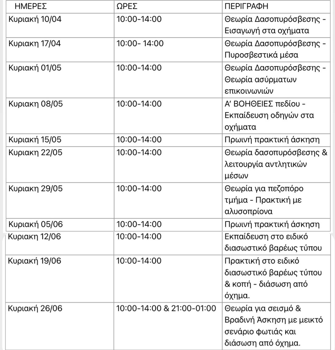 Σας ενημερώνουμε ότι από την Κυριακή 10/4 έως και την Κυριακή 26/6, κάθε Κυριακή, εκτός του Πάσχα, θα πραγματοποιείται πρόγραμμα εκπαίδευσης ασκήσεων (θεωρίας και πρακτικής εφαρμογής) στις εγκαταστάσεις του ΠΥΣΕΘ (οδός Μανου Κατράκη 1 & Λεωφ. Μαραθωνος, περιοχή Προβάλινθος, 400m μετά το φανάρι της Αγίας Μαρίνας προς Αθήνα). Το πρόγραμμα είναι δωρεάν και απευθύνεται τόσο στους εθελοντές της ομάδας αλλά και σε όποιον επιθυμεί να ενημερωθεί και να συμμετέχει.
