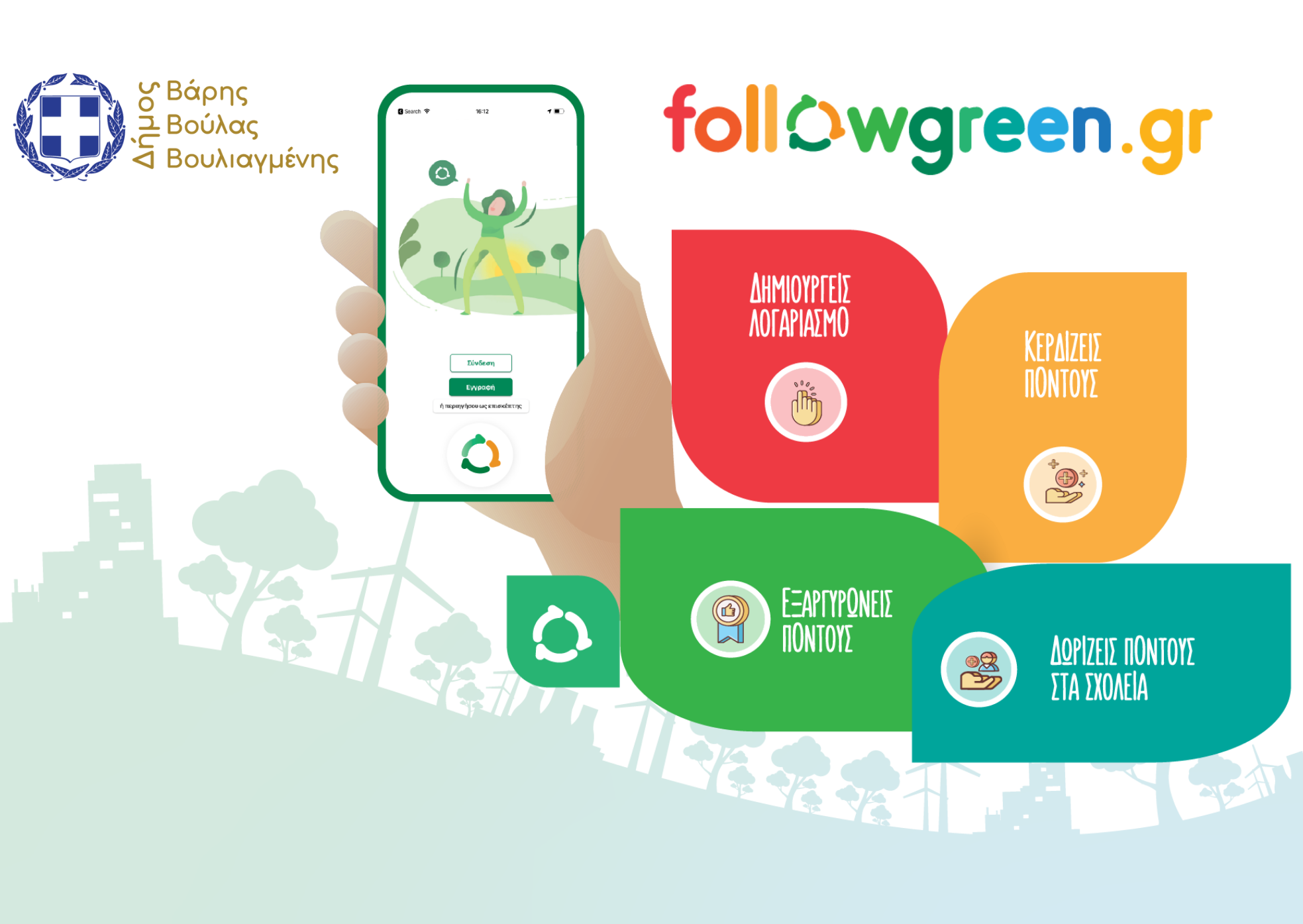 Ο Δήμος Βάρης Βούλας Βουλιαγμάνης, προσκαλεί όλους τους πολίτες και τις επιχειρήσεις του Δήμου να αγκαλιάσουν και να δυναμώσουν το εγχείρημα του Followgreen και να γίνουν μέρος της προσπάθειας του Δήμου μας για μία πόλη καθαρή και πραγματικά πράσινη.