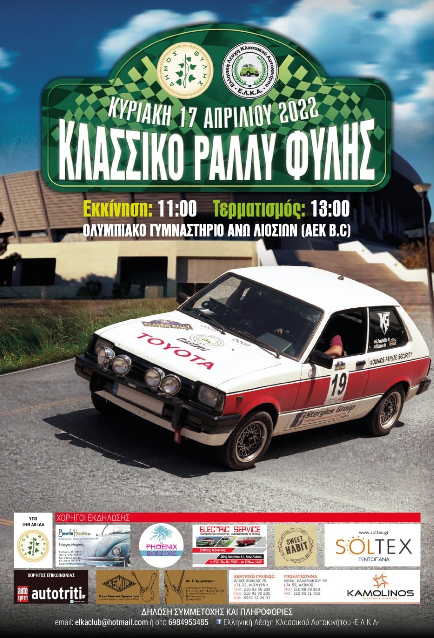Η Ελληνική Λέσχη Κλασσικού Αυτοκινήτου διοργανώνει υπό την Αιγίδα του Δήμου Φυλής το ”ΚΛΑΣΣΙΚΟ ΡΑΛΛΥ ΦΥΛΗΣ” το οποίο θα διεξαχθεί την Κυριακή 17 Απριλίου και ώρα εκκίνησης 11:00πμ.
