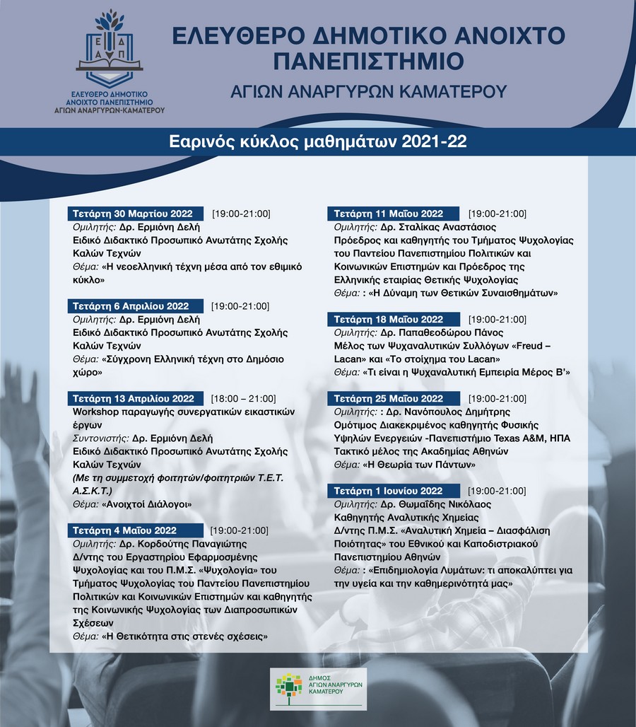 Στις 30 Μαρτίου 2022 αρχίζει ο εαρινός κύκλος σπουδών του ΕΔΑΠ Αγίων Αναργύρων-Καματερού