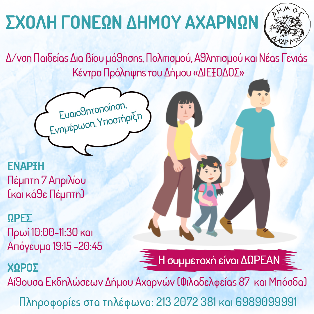 Η Δ/νση Παιδείας, Πολιτισμού, Αθλητισμού & Νέας Γενιάς του Δήμου Αχαρνών σε συνεργασία με το Κέντρο Πρόληψης «ΔΙΕΞΟΔΟΣ» θα λειτουργήσουν Σχολή Γονέων, κάθε Πέμπτη από τις 7 Απριλίου και ώρες 10:00 – 11:30 (πρωινό τμήμα) και 19:15 – 20:45 (βραδινό τμήμα), στην Αίθουσα Εκδηλώσεων του Δήμου. Η συμμετοχή δεν είναι υποχρεωτική κάθε εβδομάδα και είναι ΔΩΡΕΑΝ. Η Σχολή Γονέων έχει ως σκοπό την εκπαίδευση και τη στήριξη κάθε μητέρας και πατέρα στον σύνθετο ρόλο του γονέα όπως διαμορφώνεται από τις σύγχρονες κοινωνικοοικονομικές συνθήκες. Απευθύνεται σε γονείς παιδιών όλων των ηλικιών, παρέχει στους γονείς γνώσεις χρήσιμες, για το οικογενειακό και το σχολικό περιβάλλον καθώς και ανταλλαγή εμπειριών και ευκαιρίες για προβληματισμό.