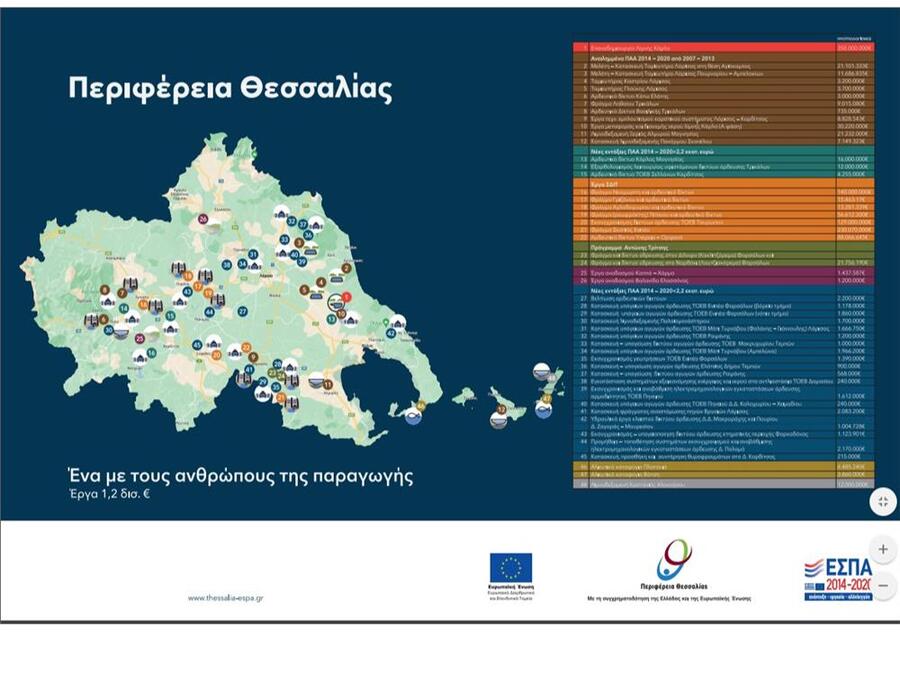 48  έργα υποδομών συνολικού προϋπολογισμού 1,24 δις ευρώ για τον εκσυγχρονισμό της παραγωγής στον πρωτογενή τομέα, ολοκληρώθηκαν, εξελίσσονται και δρομολογούνται στην Περιφέρεια Θεσσαλίας. Πρόκειται για  έργα   από την Περιφέρεια Θεσσαλίας, το Υπουργείο Αγροτικής Ανάπτυξης και το Υπουργείο Υποδομών, που οδηγούν σε  αποταμίευση και εξορθολογισμό της διαχείρισης του αρδευτικού νερού, (ταμιευτήρες, φράγματα, λιμνοδεξαμενές, δίκτυα υπόγειων αγωγών),  έργα εξοικονόμησης ενέργειας στην αγροτική παραγωγή,  έργα αναδασμού και αλιευτικά καταφύγια.