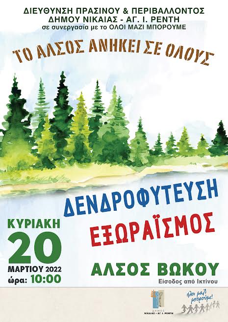 Mε γενικό σύνθημα «Το Άλσος Ανήκει σε όλους», ο Δήμος Νίκαιας-Αγ.Ι. Ρέντη σε συνεργασία με το ΌΛΟΙ ΜΑΖΙ ΜΠΟΡΟΥΜΕ πραγματοποιεί. μια γιορτή περιβαλλοντικής ευαισθητοποίησης την Κυριακή 20 Μαρτίου στις 10 το πρωί στο ‘Αλσος Βώκου (είσοδος από Ικτίνου). Την ευθύνη της εκδήλωσης έχει η Διεύθυνση Πρασίνου και Περιβάλλοντος υπό το συντονισμό του αρμόδιου Αντιδημάρχου Νίκου Άννινου. Οι δράσεις περιλαμβάνουν δενδροφυτεύσεις με φυτά που προέρχονται από το φυτώριο του Δήμου, καθαρισμό του χώρου από ξερά χόρτα, κλαδιά και σκουπίδια και απευθύνονται σε όλες τις ηλικίες. Κατά τη διάρκεια αυτής της περιβαλλοντικής εξόρμησης θα τηρηθούν τα ισχύοντα υγειονομικά πρωτόκολλα.