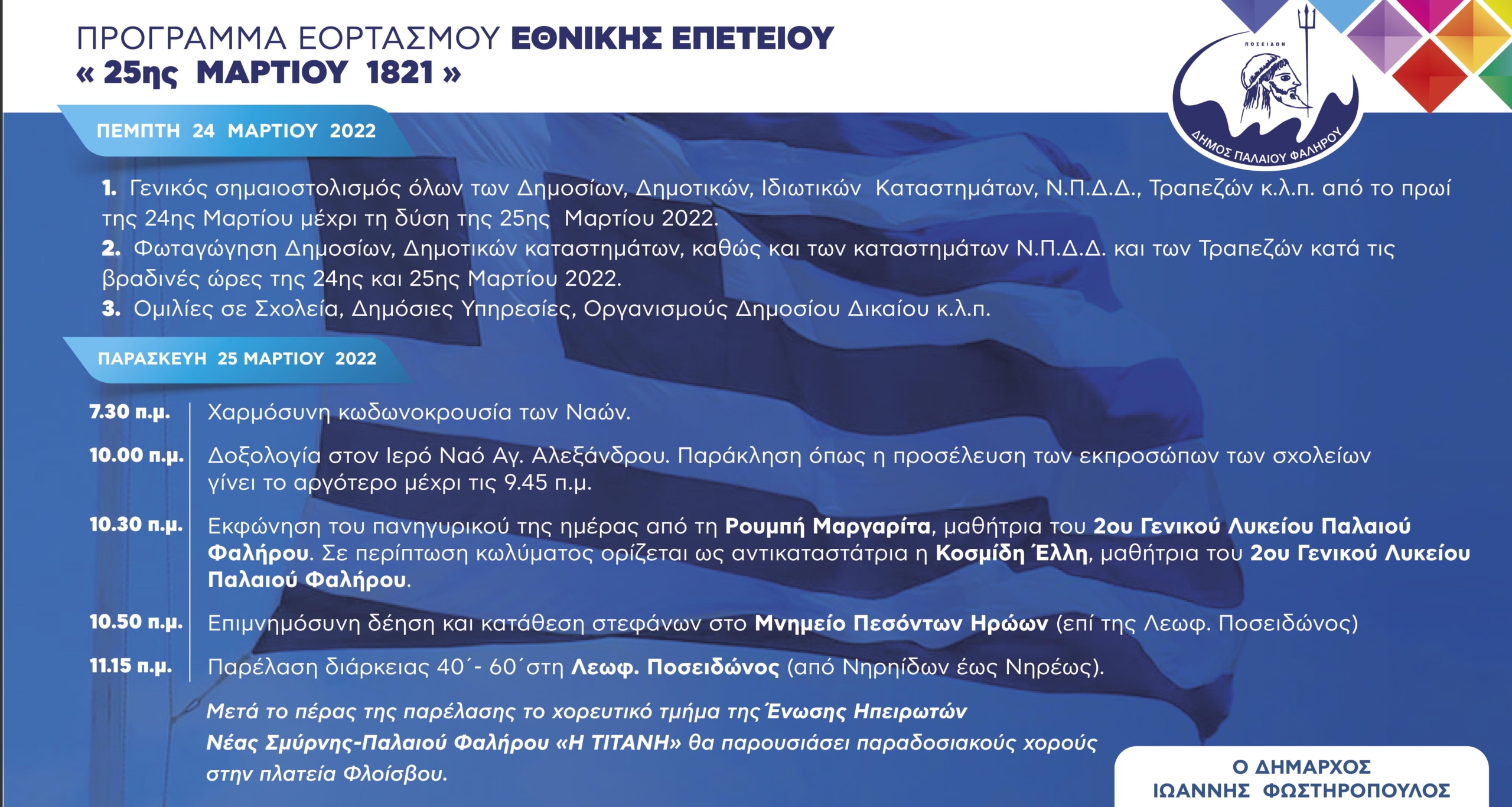 O Δήμος Παλαιού Φαλήρου και ο Δήμαρχος Γιάννης Φωστηρόπουλος, αποδίδοντας τιμή στους ήρωες της Επανάστασης του 1821 γιορτάζουν μαζί με τους δημότες με κάθε επισημότητα, την Εθνική Επέτειο της 25ης Μαρτίου και προσκαλούν κάθε πολίτη να τιμήσει με την παρουσία του, τις εορταστικές εκδηλώσεις του διημέρου 24 & 25/3/22 στην πόλη μας.