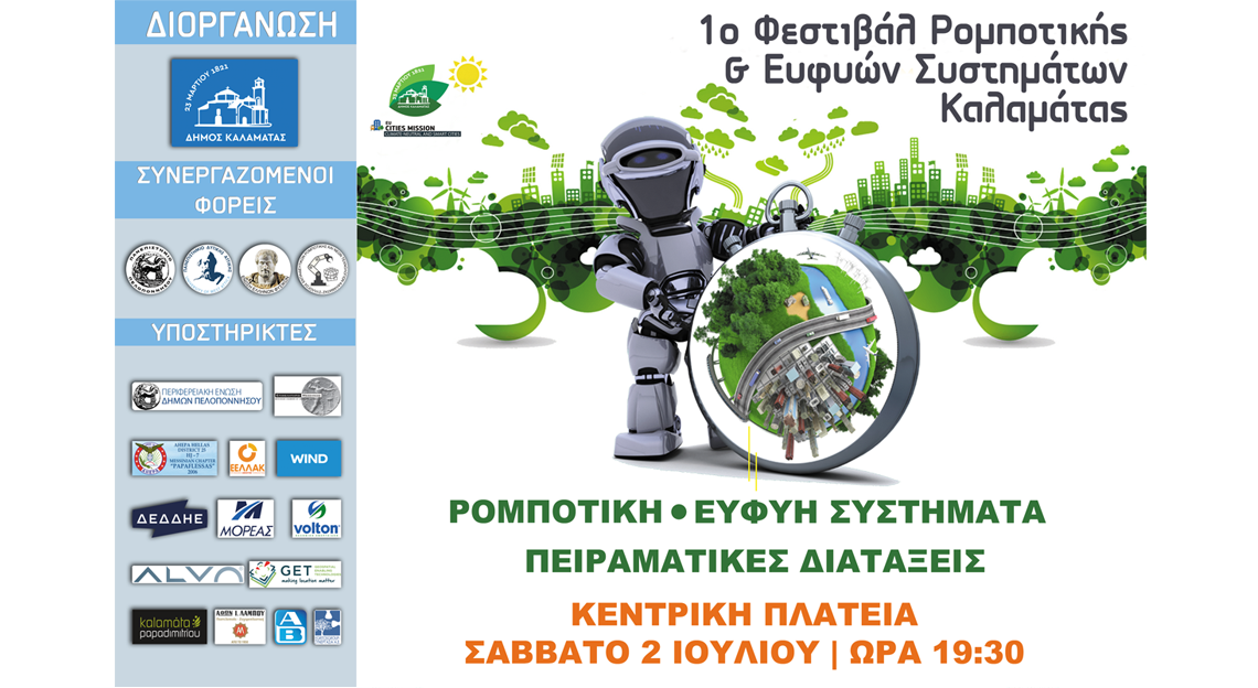Το 1ο Φεστιβάλ Ρομποτικής & Ευφυών Συστημάτων που διοργανώνει ο Δήμος Καλαμάτας οδεύει προς την τελική του φάση, η οποία θα λάβει χώρα στην Κεντρική Πλατεία της Καλαμάτας, το Σάββατο 2 Ιουλίου 2022 και ώρα 19:30.