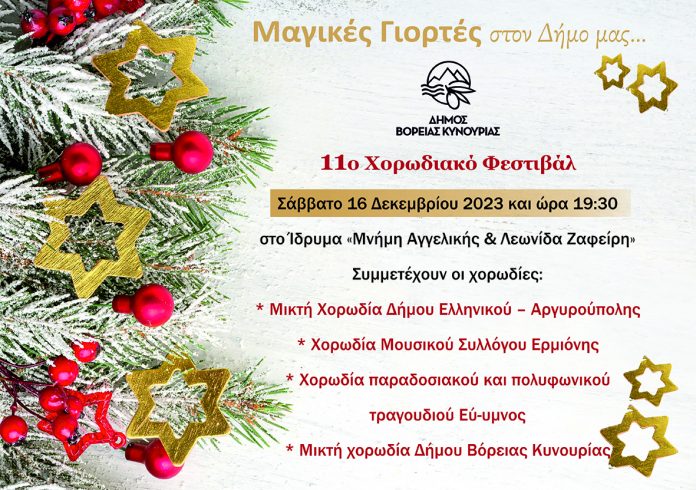 Σας προσκαλούμε να παρευρεθείτε στο 11ο χορωδιακό φεστιβάλ Δήμου Βόρειας Κυνουρίας, το οποίο καθιερώθηκε και έγινε θεσμός πλέον για τα πολιτιστικά δρώμενα του Δήμου μας.